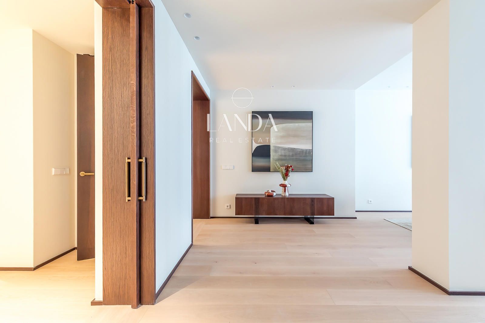 La vivienda se despliega en una planta diáfana y luminosa donde los espacios sociales cobran verdadero protagonismo. El amplio salón-comedor fluye con naturalidad hacia una terraza privada que inunda de luz natural el interior, creando una continuidad entre el adentro y el afuera que amplifica la sensación de espacio. El parquet de roble claro recorre toda la vivienda dotándola de calidez y coherencia, mientras la carpintería a medida en roble ahumado con herrajes en latón mate eleva la calidad percibida en cada acceso y cada rincón.