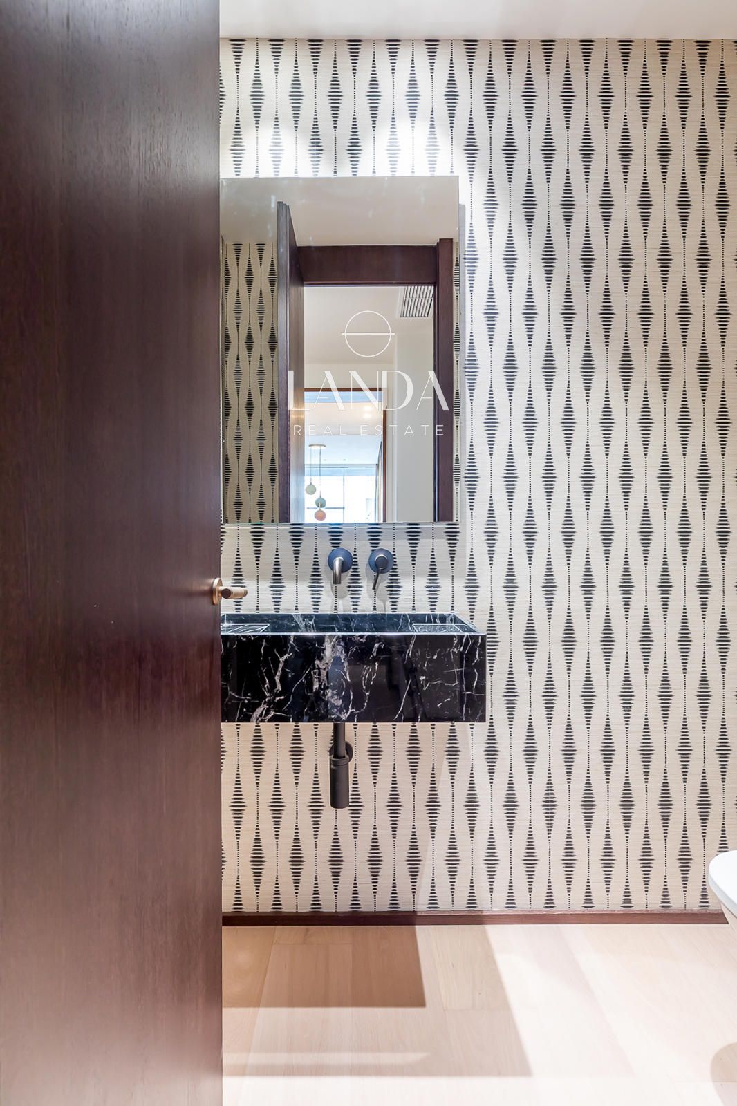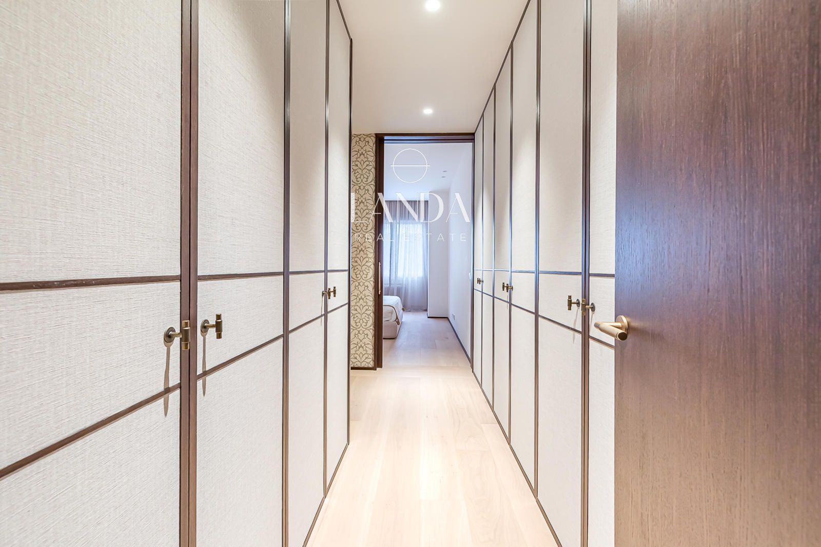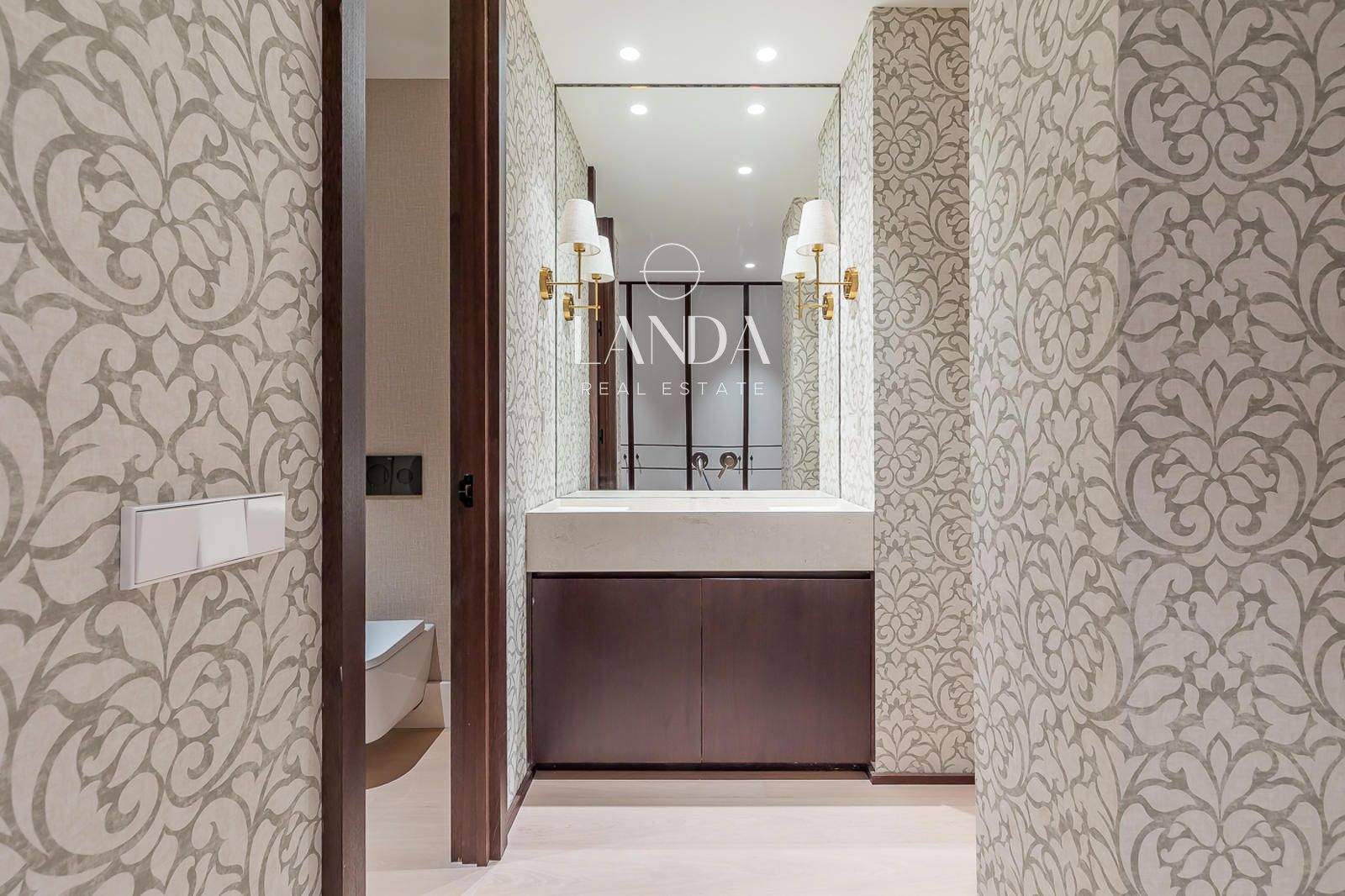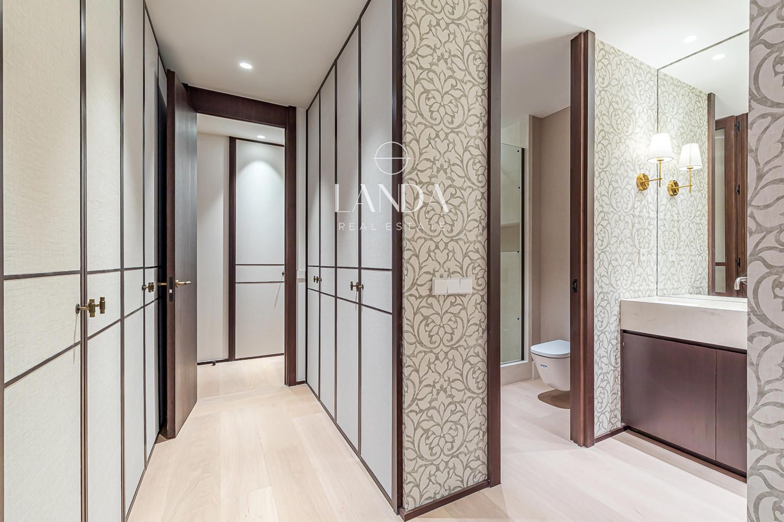 Los cuatro dormitorios están concebidos como refugios privados de máximo confort. La suite principal dispone de un baño en suite de nivel excepcional —con doble lavabo en piedra, papeles pintados de gran carácter y apliques en latón dorado— y acceso directo a un generoso vestidor con cajoneras empotradas. Los dormitorios secundarios, amplios y bien orientados, cuentan con baños propios igualmente cuidados, cada uno con una identidad propia: desde el aseo de cortesía de fuerte personalidad visual hasta los baños completos con ducha de lluvia y soluciones de almacenamiento integradas.