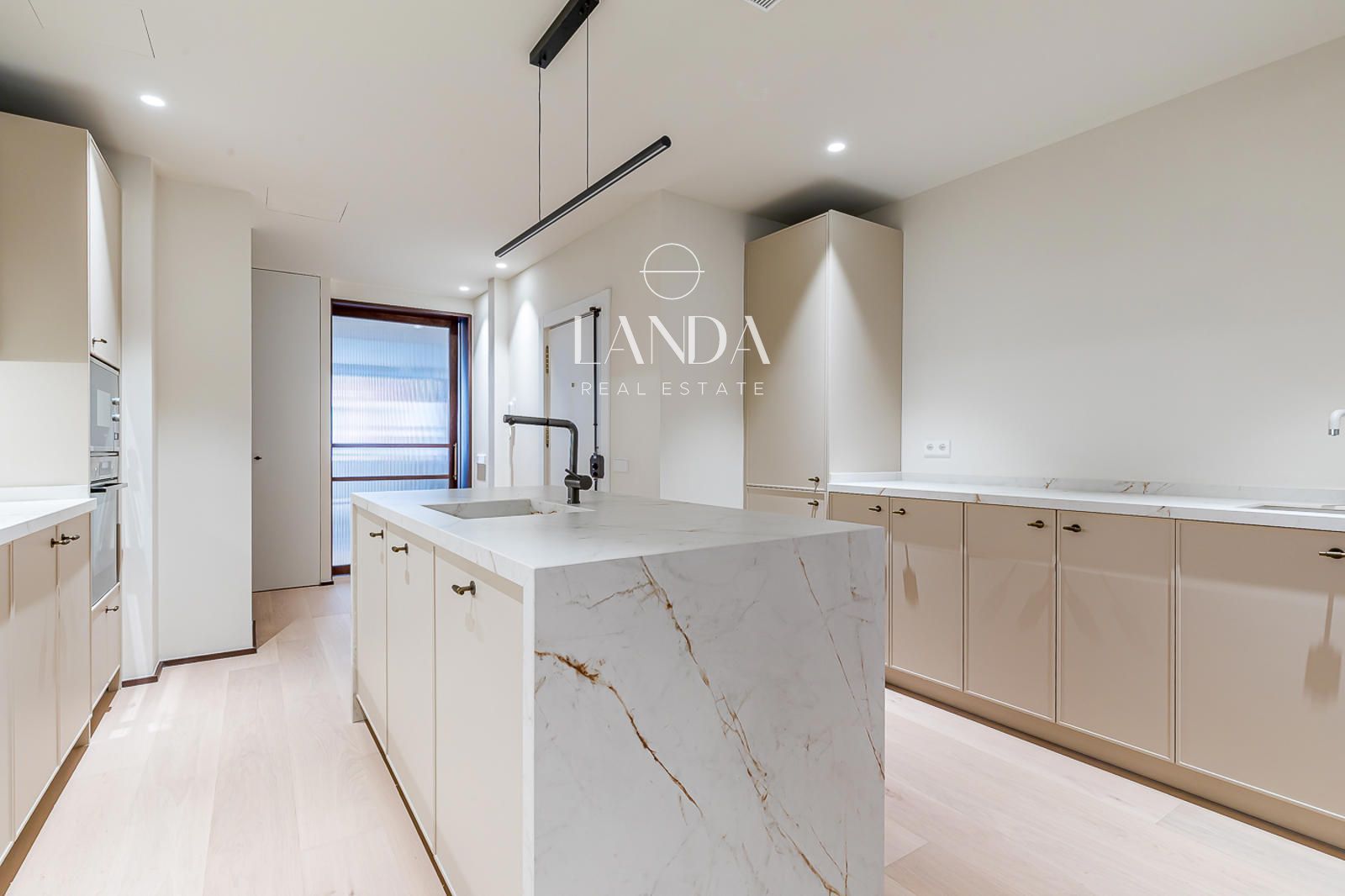 La cocina es una declaración de intenciones. La gran isla central en piedra sinterizada Calacatta —con su característico veteado dorado sobre fondo blanco marfil— se convierte en el corazón funcional y estético del espacio. Los electrodomésticos Bosch de última generación están perfectamente integrados en una línea de muebles lacados de exquisita factura, completada por un backsplash de mármol blanco y una iluminación técnica de gran precisión. Una cocina que combina con maestría la eficiencia profesional y la belleza de los materiales nobles.