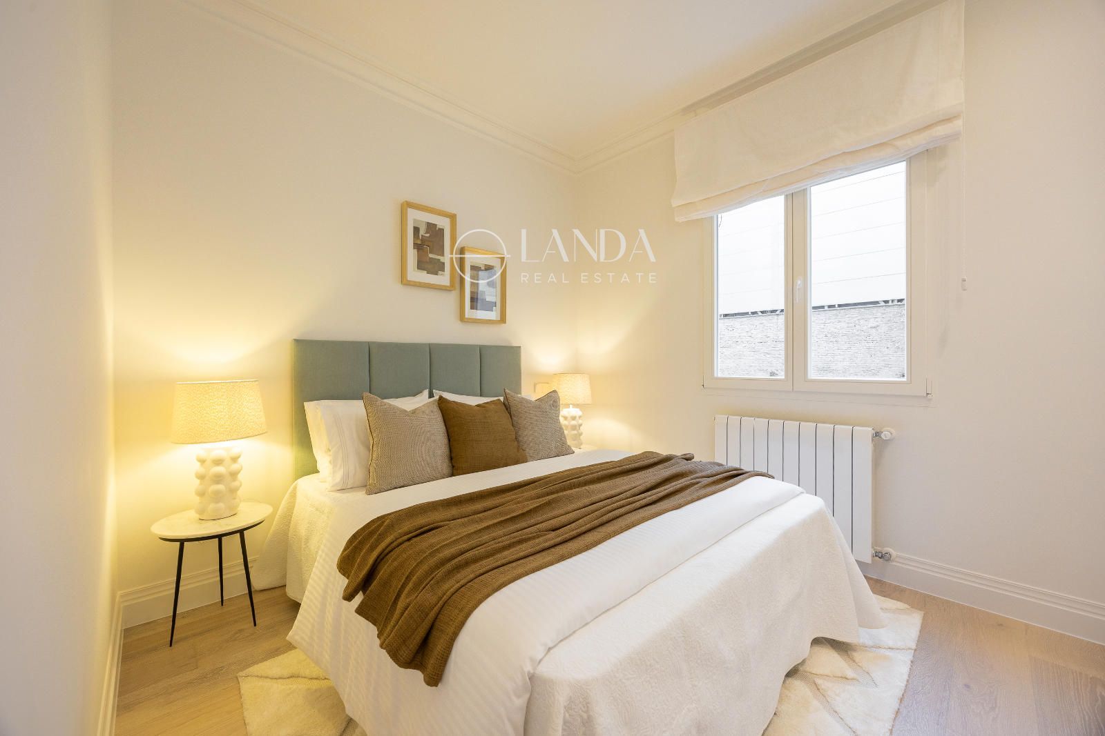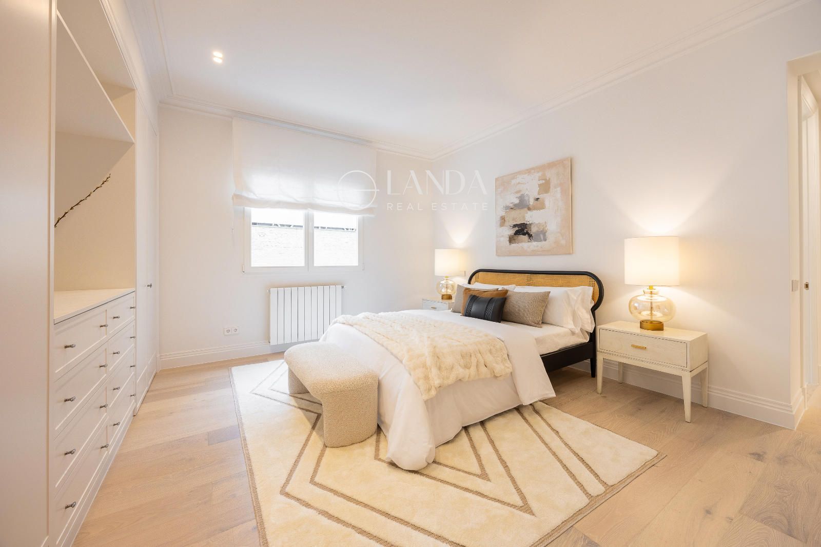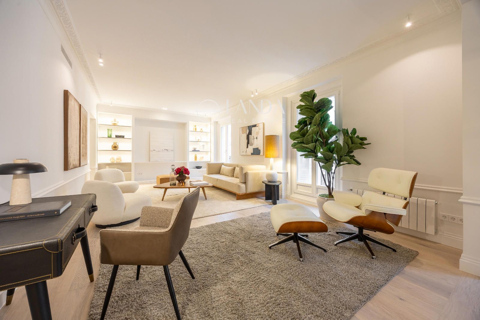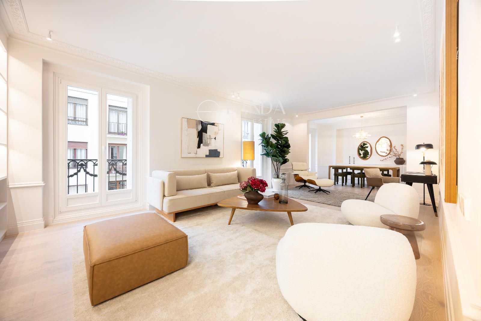 Vivienda totalmente reformada y amueblada de 269 m² en el barrio de Goya, Salamanca. Cuarta planta exterior con orientación Oeste. Dispone de amplio salón-comedor con cocina abierta, terraza privada, 4 dormitorios (principal con vestidor y baño en suite), 3 baños, 1 aseo, lavandería y trastero. Acabados premium, ascensor y servicio de conserjería.