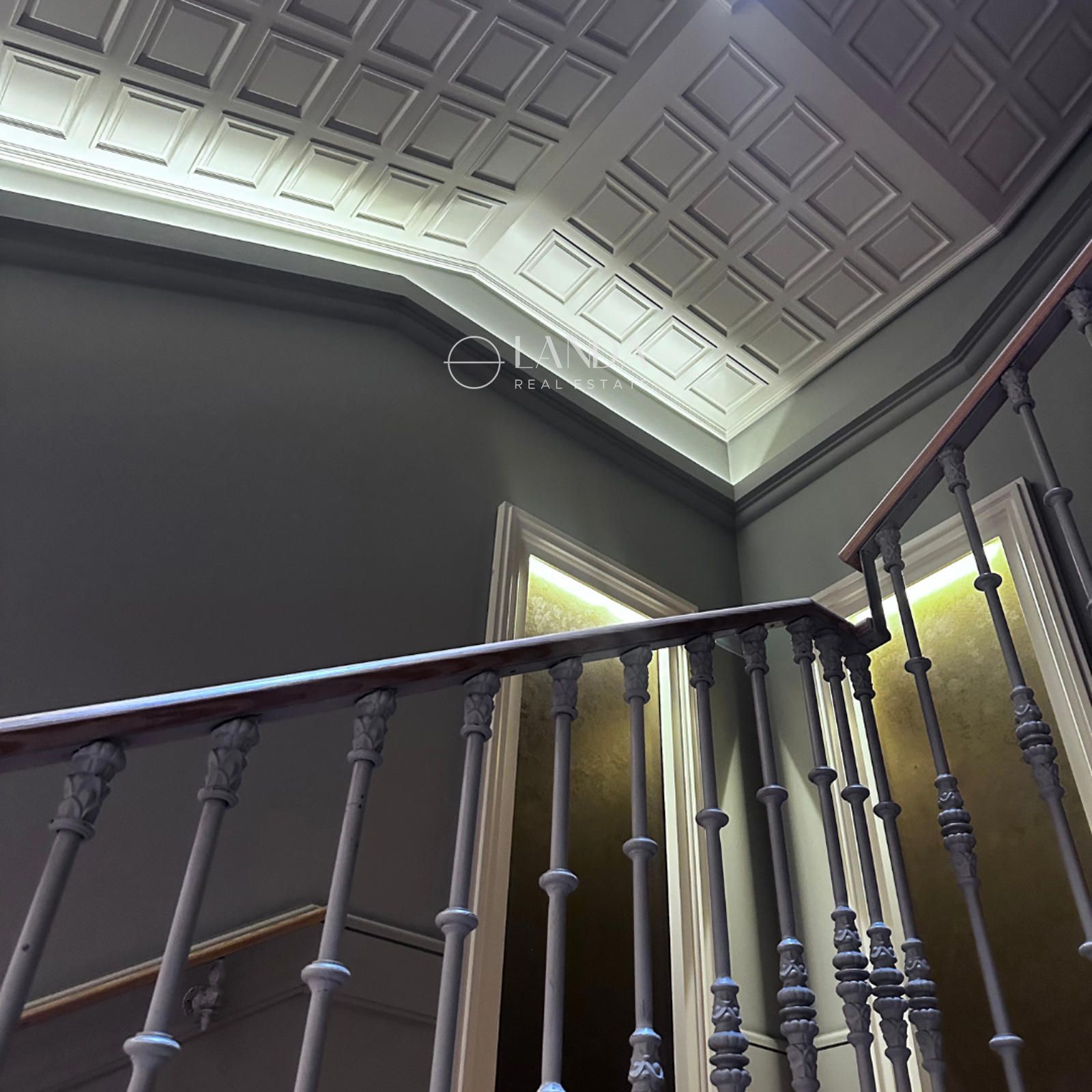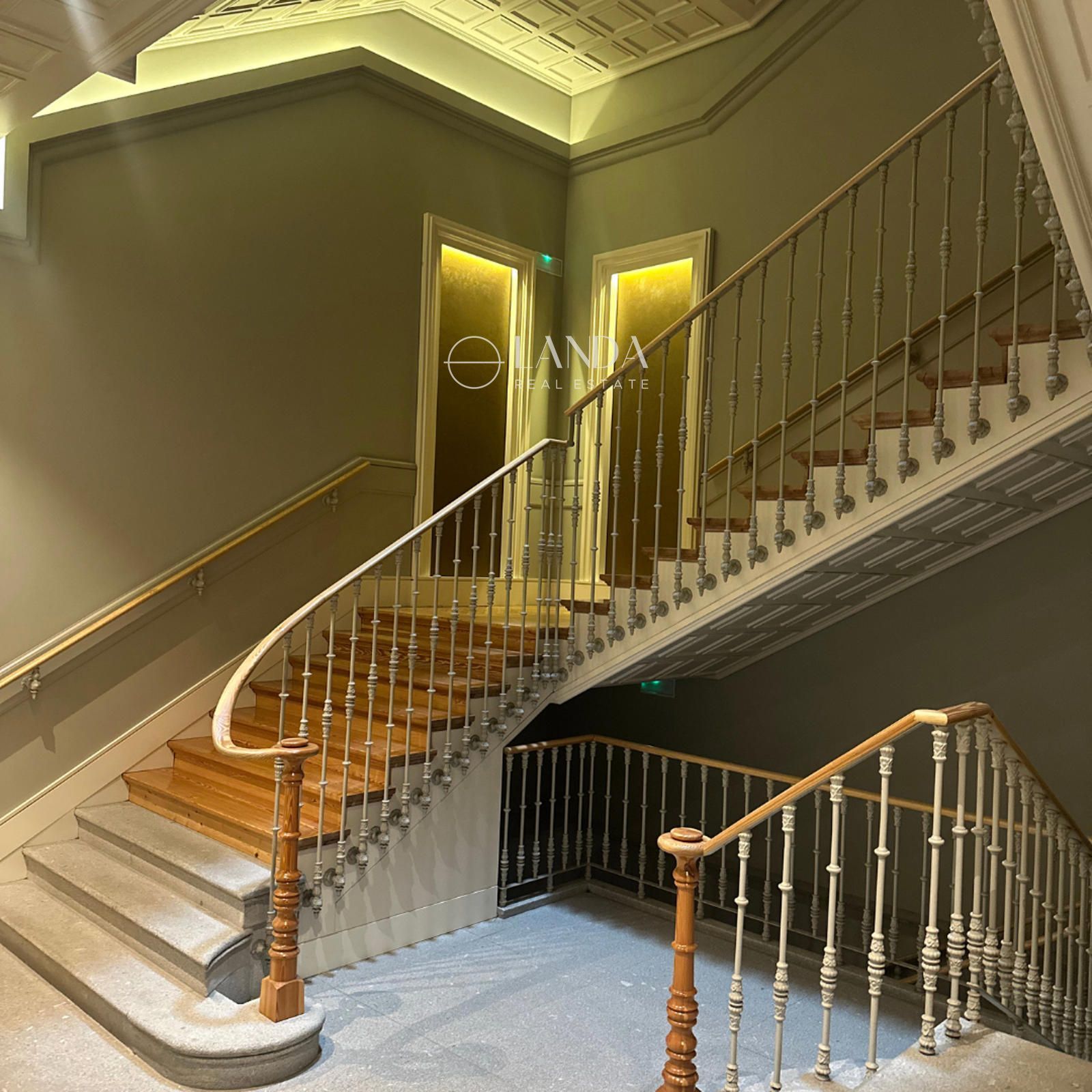 Con 259 m² construidos, orientación sur y ventanales de casi 4 metros de altura, la luz natural es una de las grandes protagonistas. El edificio, rehabilitado integralmente en 2014, mantiene la elegancia de su fachada y escalera histórica, pero incorpora comodidades contemporáneas como gimnasio, dos plazas de garaje y trastero.