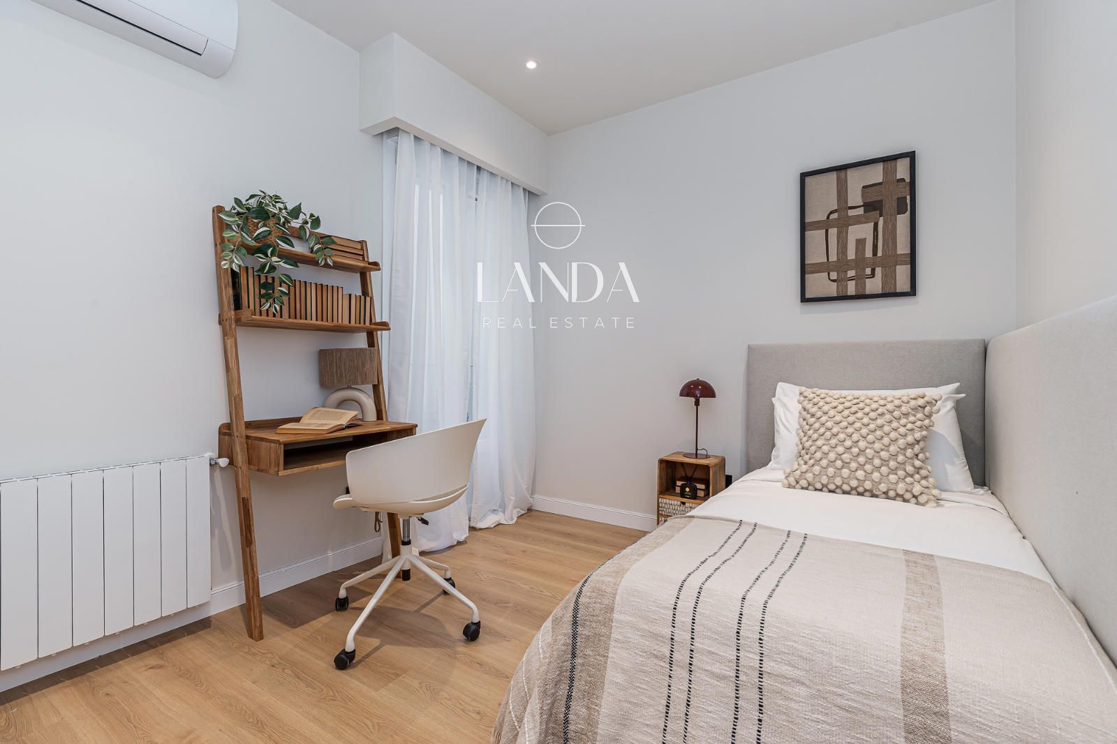 La zona privada se compone de tres dormitorios, todos con una cuidada estética y armarios empotrados. El dormitorio principal dispone de baño en suite, mientras que la vivienda cuenta además con un segundo baño completo y un aseo de cortesía. La climatización por aire acondicionado y la calefacción individual garantizan el máximo confort durante todo el año.