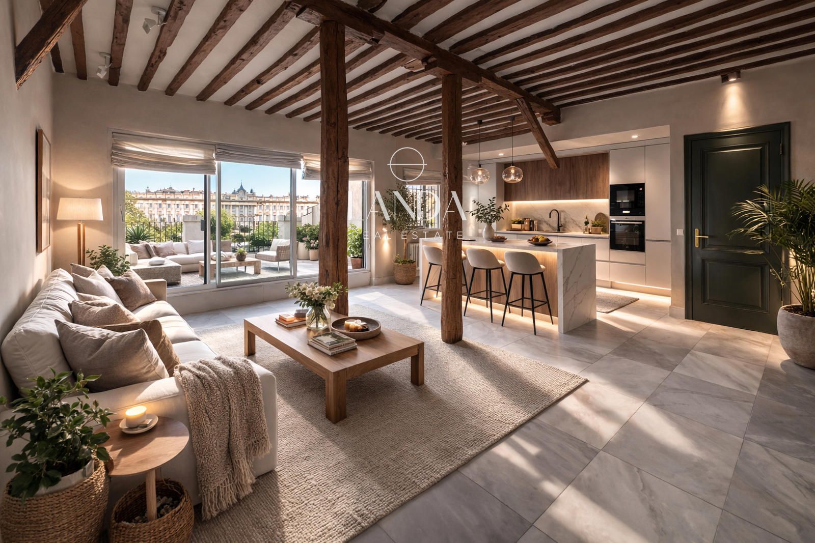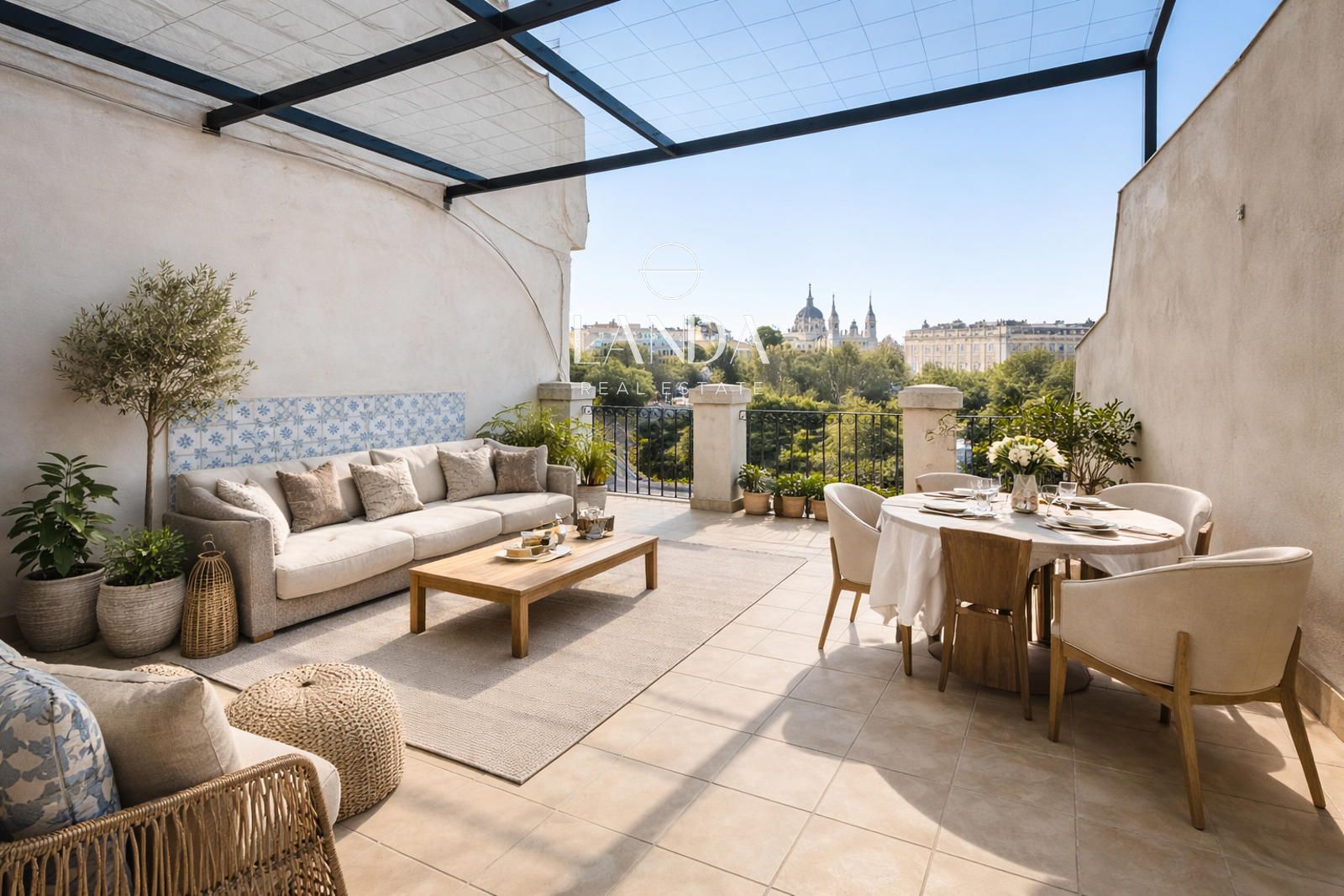 En una de las ubicaciones más emblemáticas de Madrid, este ático en finca histórica ofrece una propuesta difícil de replicar: carácter arquitectónico, luz y una terraza de aproximadamente 30 m² con una panorámica frontal sobre el Palacio Real y los jardines de Plaza de Oriente.