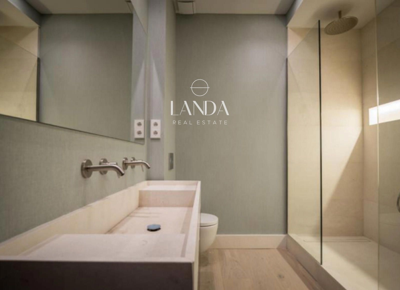 Los dos baños y el aseo de visitas reciben tratamientos diferenciados que elevan cada uno a la categoría de espacio singular. El baño principal incorpora plato de ducha en piedra caliza con paredes en Mortex —un micromortero mineral que evoca el hormigón pulido, impermeable y de gran durabilidad—, grifería empotrada TRES, encimera de caliza y mueble bajo de diseño. El segundo baño combina plato de caliza con cerámica de pequeño formato en paredes, mueble con encimera de piedra caliza, suelo de mármol y paredes empapeladas. El aseo de visitas mantiene la misma calidad con lavabo de piedra natural, grifería empotrada y paredes empapeladas.